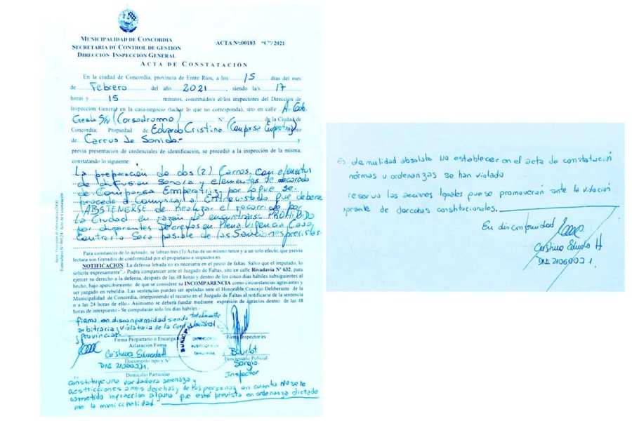 Eduardo Cristina, titular de la comparsa Emperatriz y quien -paradójicamente- formaba parte hasta hace pocos días de la gestión municipal, firmó el acta labrad "en disconformidad", ya que no se especificaban "las normas u ordenanzas" que se violaban con la celebración. También anticipó "acciones legales que se promoverán", por lo que consideró una violación a sus derechos.