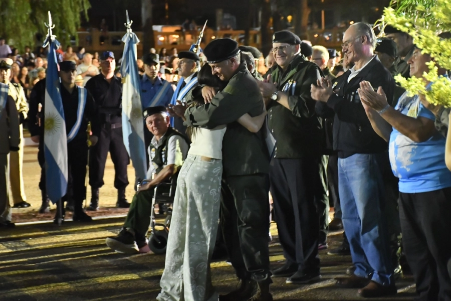 El momento de mayor emoción de la noche fue el simulacro del Desembarco en las Islas, protagonizado por cuatro ex combatientes que, a bordo de una lancha que navegó por el río Uruguay, llegaron hasta la costa y descendieron con una bandera argentina. Con ella en alto, corrieron por la arena de la playa Los Sauces, en una escena que conmovió profundamente a los presentes.