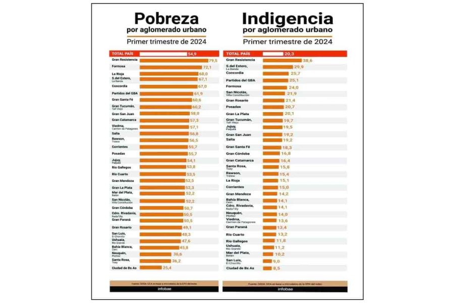Con los datos oficiales del Indec, y por aglomerado urbano, las estimaciones de la UCA ubican a la región de Gran Resistencia, Chaco, como la más pobre del país con una tasa del 79,5%. La indigencia alcanza al 38,6% de la población. Le sigue Formosa con un 72% de pobres y Santiago del Estero- La Banda con casi 30% de indigentes. Pero la mayoría de las regiones tienen niveles de pobreza por encima del 50% y del 15%, en el caso de la indigencia.
