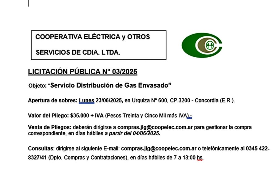 Por medio de la Licitación Pública N° 03/2025 la Cooperativa Eléctrica de Concordia convoca a interesados en prestar el servicio de distribución de gas envasado.