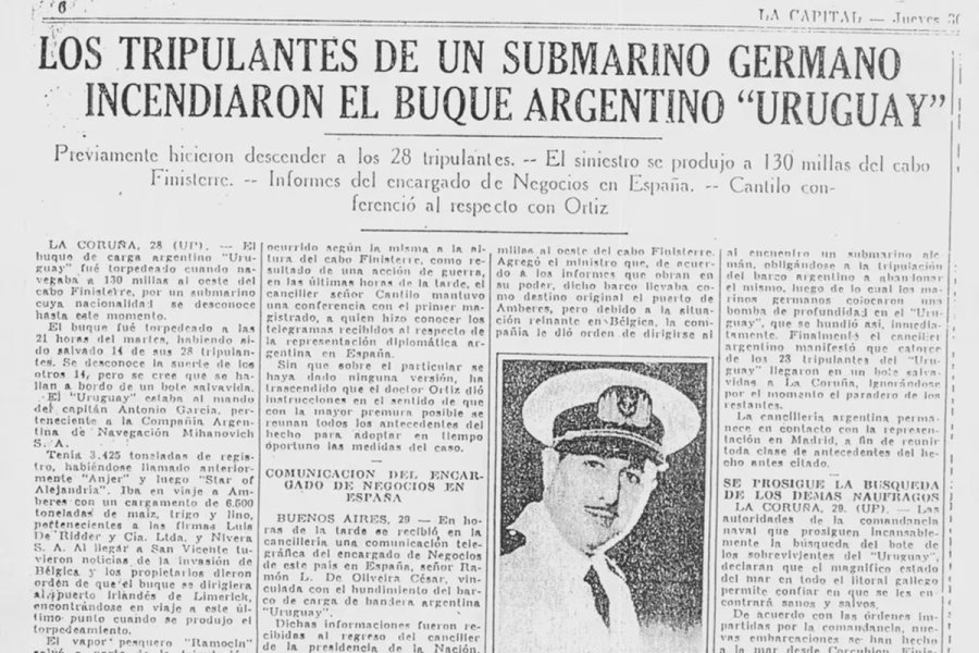 La noche aciaga del Uruguay comenzó a las 20 horas de aquel 27 de mayo. Argentina era un país neutral en medio de la guerra. Como potencia agropecuaria, abastecía con alimentos tanto a la logística de las fuerzas aliadas como a las tropas del Eje. Por eso, eran muchos los cargueros que llevaban nuestra bandera a través del Atlántico. El U-37 se aproximó al vapor argentino. Desde la torreta, un oficial nazi exigió que detuvieran sus máquinas. El capitán García entregó la documentación que acreditaba que el barco pertenecía a una nación neutral y que se dirigía a Limerick. Sin embargo, no fue suficiente. Un grupo de marinos nazis abordaron el buque mercante y comenzaron a revisar la carga. Luego, sin demasiadas explicaciones, le indicó al capitán que le daba 20 minutos a la tripulación para recoger sus pertenencias y abandonar la nave en dos botes. Luego colocaron explosivos en la proa y la popa. Desde las barcazas, los 28 tripulantes del Uruguay -entre los que había 9 españoles, un portugués, un paraguayo y un griego- vieron cómo se iluminaba la noche con las explosiones. La faena fue remataba con disparos del cañón de 1055 mm del que disponía. En minutos, el buque de la compañía Mihanovich se hundió. Fue el primero de tres embarcaciones de bandera nacional que atacaron los submarinos nazis. El 17 de abril de 1942 fue torpedeado el buque tanque Victoria. Y el 22 de junio de ese mismo año, el buque mercante Río Tercero se fue a pique luego del bombardeo del sumergible U-202.