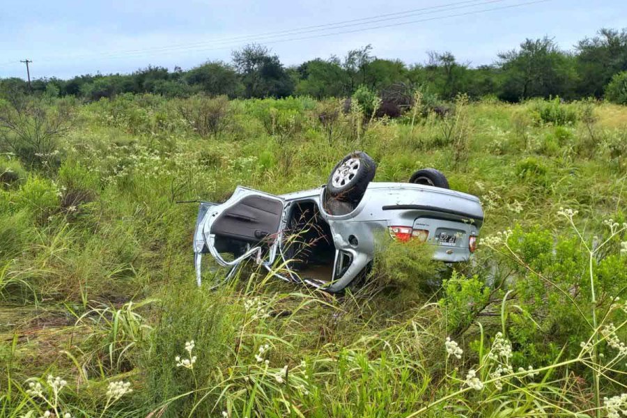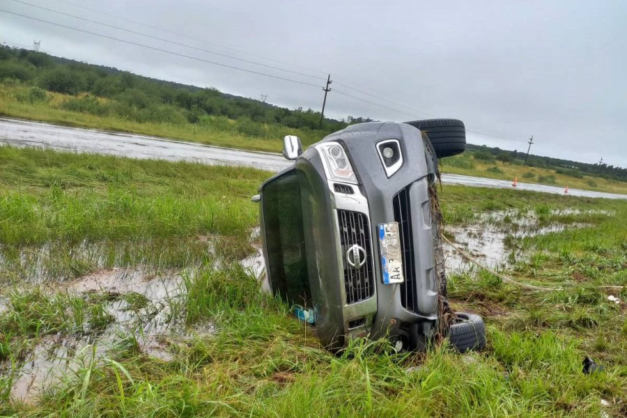Debido a las condiciones climáticas y el mal estado de la ruta, el rodado despistó y volcó; atravesando el cantero central y terminó en el desagüe de la mano contraria.