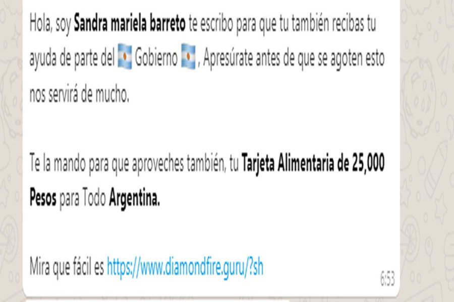 En los mensajes prometen ayuda económica por 25.000 pesos o 50.000 pesos que en realidad no existen. También ofrecen tarjetas alimentarias por altos montos de dinero cuando en verdad son de hasta seis mil pesos.