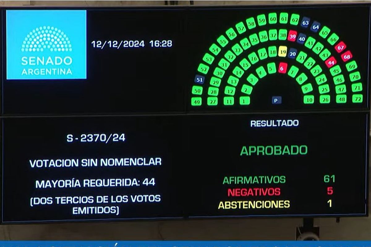 Asimismo, hubo una abstención que fue la del senador de Salta perteneciente a Cambio Federal. Del mismo modo es necesario aclarar que los ausentes en la sesión especial de este jueves fueron José Carambia de la provincia de Santa Cruz, Natalia Gadano, del partido Somos Energía para Renovar Santa Cruz, Gerardo Antenor Montenegro, Frente Nacional y Popular de Santiago del Estero, Víctor Zimmermann, de la Unión Cívica Radical y el obviamente ausente Edgardo Kueider.