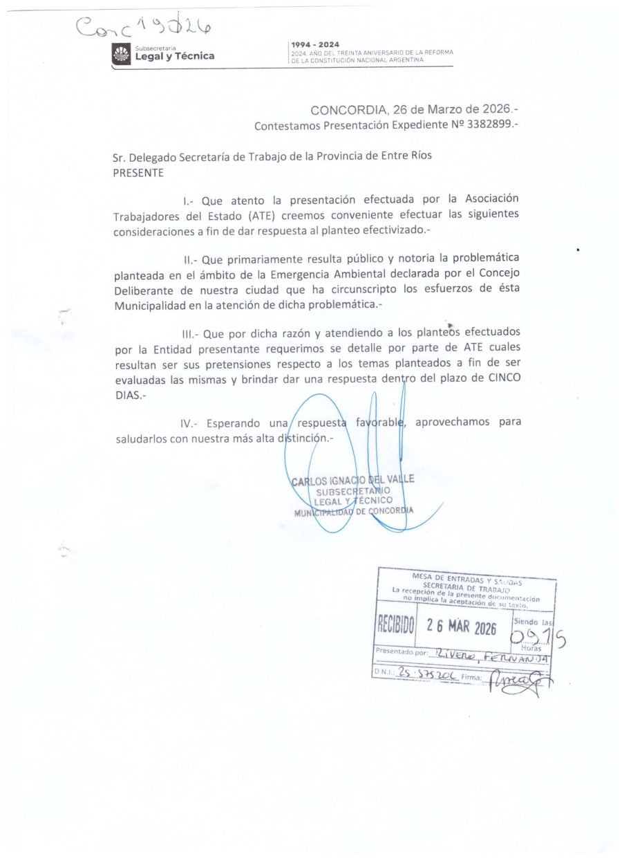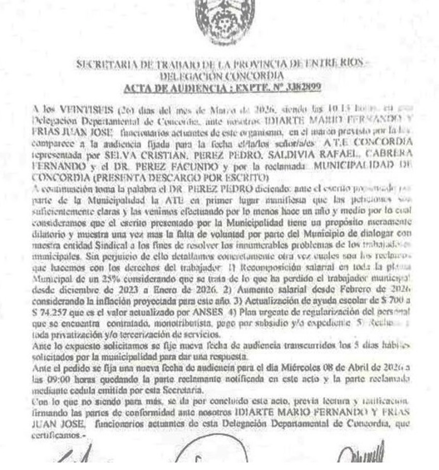 La seccional Concordia de la Asociación de Trabajadores del Estado (ATE) informó que - en la mañana de este jueves - "participamos de la audiencia oportunamente solicitada, en la cual planteamos una serie de temas de vital importancia para las trabajadoras y los trabajadores municipales".