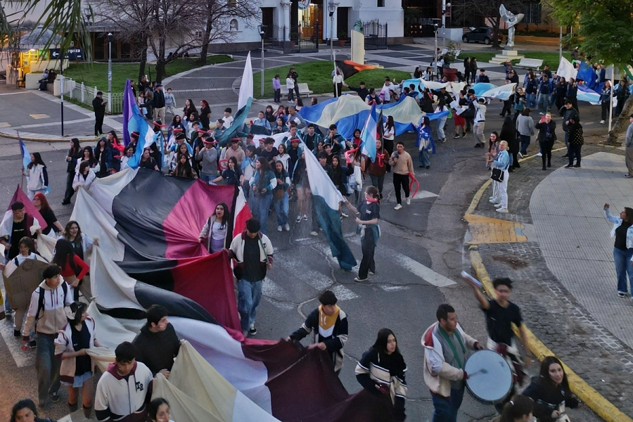 Con el colorido propio de la jornada, los estudiantes llevaron sus insignias en una caminata que marca uno de los hitos de la celebración estudiantil en la ciudad. La columna recorrió distintas arterias céntricas, sumándose el entusiasmo de familias que acompañaron desde veredas y las calles adyacencias.