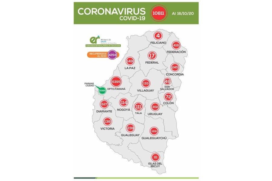 Según surge de los datos reportados por el área de Vigilancia Epidemiológica del Ministerio de Salud, en este viernes 16 de octubre, Entre Ríos ha sumado 361 casos de coronavirus.