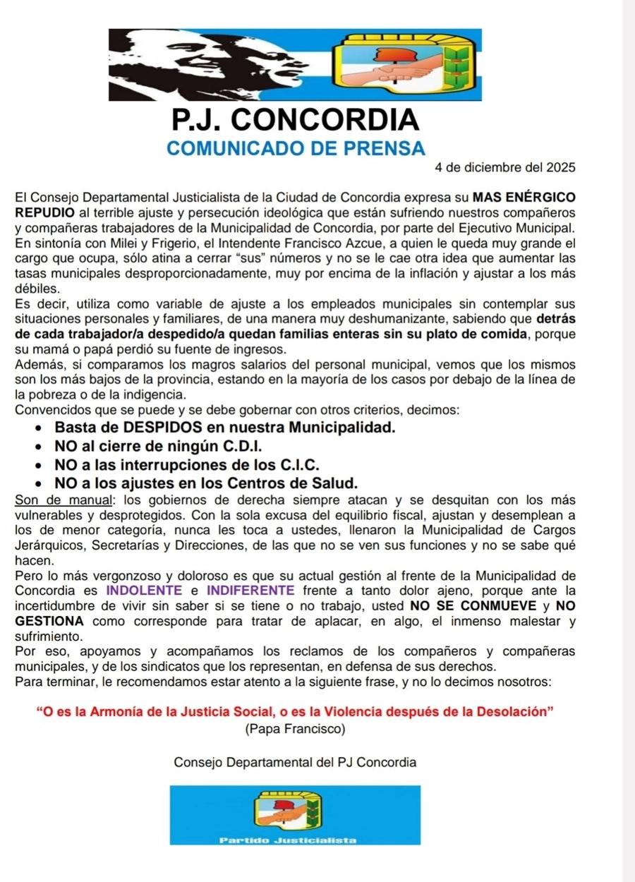 El Consejo Departamental Justicialista de la Ciudad de Concordia - a través de un comunicado de prensa- expresó que "más enérgico repudio al terrible ajuste y persecución ideológica que están sufriendo nuestros compañeros y compañeras trabajadores de la Municipalidad de Concordia, por parte del Ejecutivo Municipal".