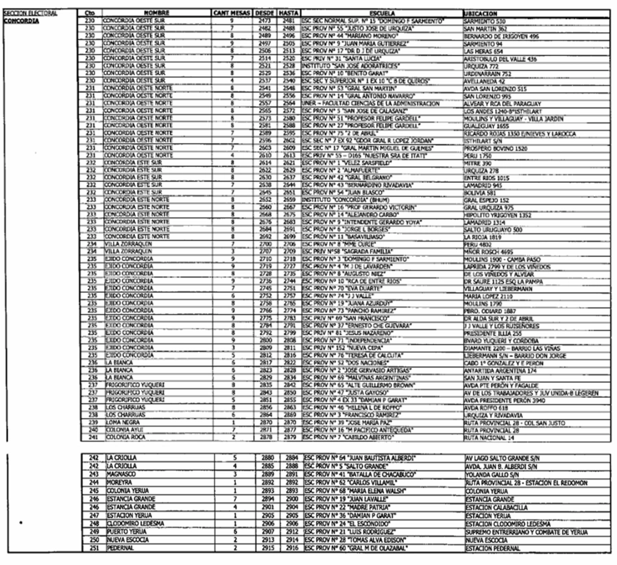 El listado de escuelas afectadas. Este domingo 26 de octubre, como ocurre cada 2 años, la provincia de Entre Ríos renovará sus bancas en la Cámara de Diputados y en el Senado de la Nación. Para eso, distintas escuelas de la ciudad de Concordia prestarán sus instalaciones para el desarrollo del acto eleccionario.