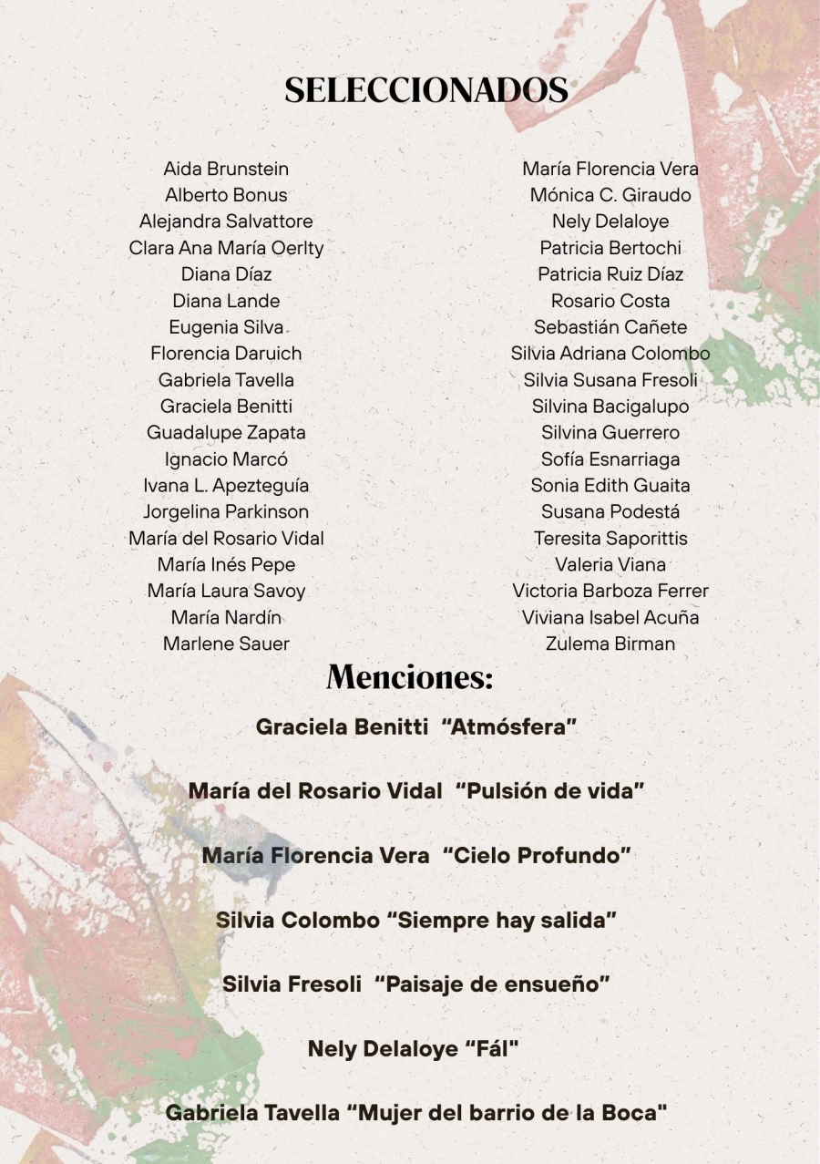 Además, destacaron a algunos de los artistas seleccionados con mención: Graciela Benitti, “Atmósfera”; María del Rosario Vidal, “Pulsión de vida”; María Florencia Vera, “Cielo Profundo”; Silvia Colombo, “Siempre hay salida”; Silvia Fresoli, “Paisaje de ensueño”; Nely Delaloye, “Fál”; Gabriela Tavella, “Mujeres del barrio de la Boca”.