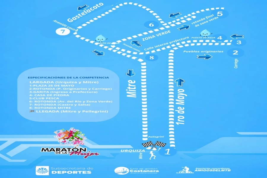 En los últimos días, también se dio a conocer el recorrido oficial de la prueba. El circuito comenzará en plaza 25 de Mayo y continuará hacia el este por calle 1° de Mayo. Luego, las participantes doblarán a la derecha por Pueblos Originarios hasta llegar a la rotonda de calle Carriego. Desde allí, el trayecto seguirá por la calle interna de Prefectura, avenida Castro, e ingresará a la Zona Verde, donde estará ubicado el puesto de hidratación.