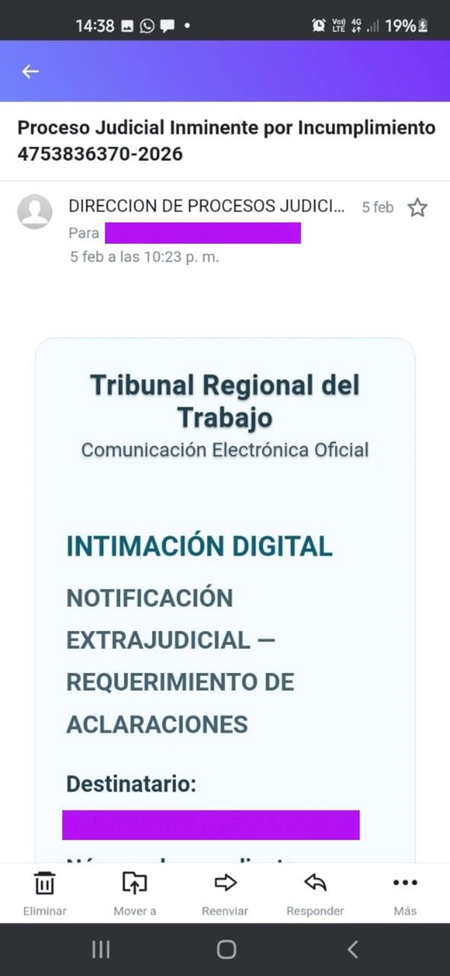 Ante esta situación, se aclara que la justicia laboral, tanto a nivel local como provincial, no realiza comunicaciones directas a ciudadanos mediante mensajería electrónica o correos electrónicos en relación con causas judiciales.