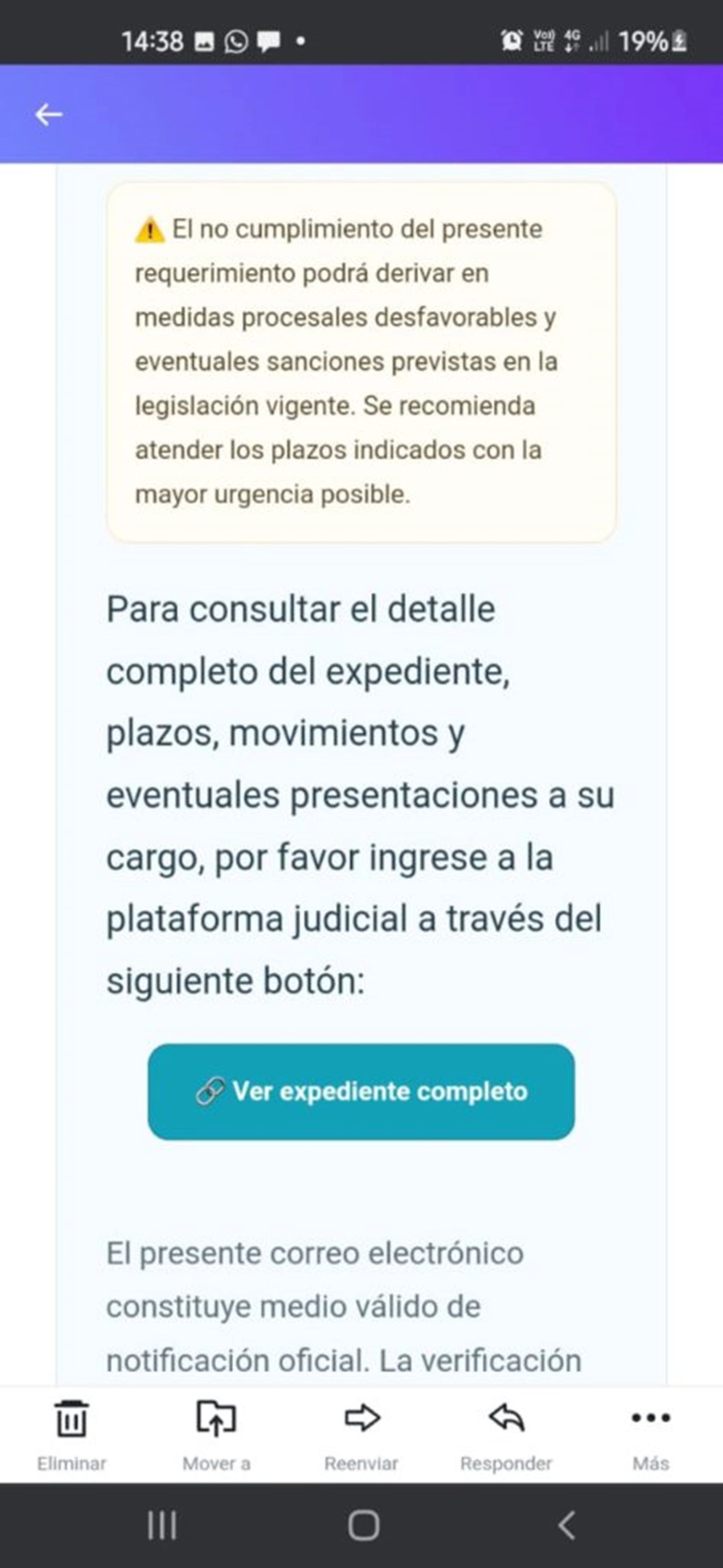 Dichas comunicaciones, que aparentan provenir de un inexistente “Tribunal Regional del Trabajo” o de un supuesto “Juzgado del Trabajo”, incluyen enlaces que conducen a falsos expedientes en trámite ante organismos laborales de esa ciudad entrerriana.
