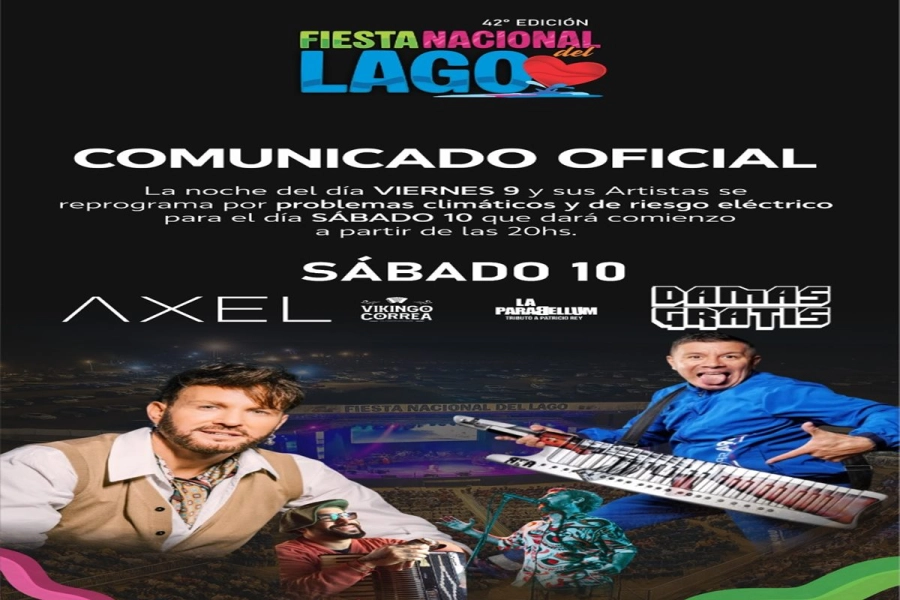 La organización de la 42ª edición de la Fiesta Nacional del Lago informó que, como consecuencia de las condiciones climáticas adversas registradas en la región, se tomó la decisión de suspender la totalidad de las actividades previstas para este viernes. La medida fue adoptada pasado el mediodía, priorizando la seguridad del público, los artistas y el personal afectado al evento.