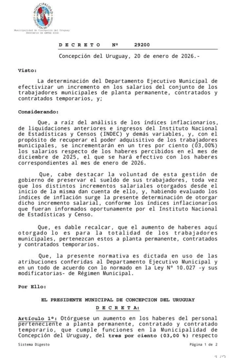 El Municipio de Concepción del Uruguay otorgó un aumento salarial del 3% para sus empleados.